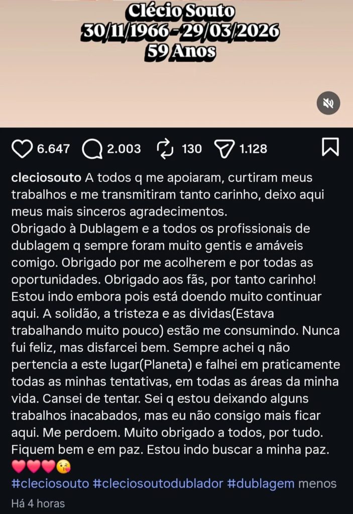 Na postagem, ele agradeceu a seus fãs e aos profissionais de dublagem que trabalharam com ele. Em seguida, escreveu: “Estou indo embora, pois está doendo muito continuar aqui. A solidão, a tristeza e as dividas (estava trabalhando muito pouco) estão me consumindo. Nunca fui feliz, mas disfarcei bem. Sempre achei que não pertencia a este lugar (planeta) e falhei em praticamente todas as minhas tentativas, em todas as áreas da minha vida”.