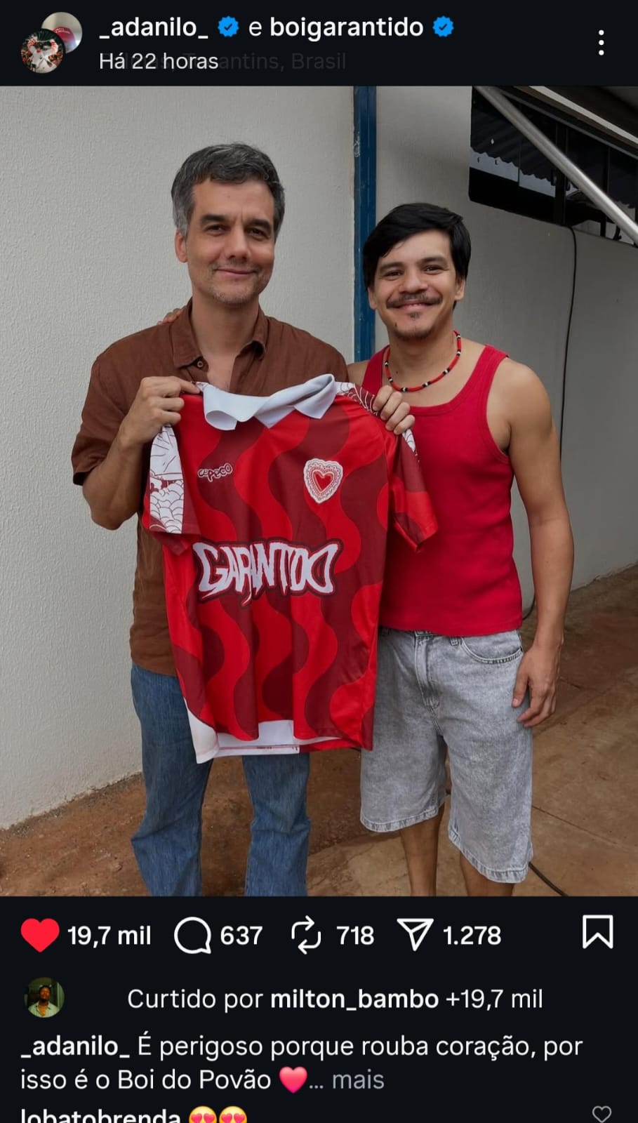 A legenda, que cita a toada “Parintins para o mundo ver”, diz: “É perigoso porque rouba coração, por isso é o Boi do Povão. Camisa do @boigarantido entregue e convite feito para Wagner Moura conhecer o Festival Folclórico de Parintins.”