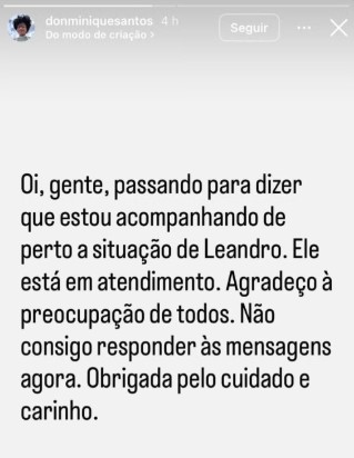 “Oi, gente. Passando para dizer que estou acompanhando de perto a situação de Leandro. Ele está em atendimento. Agradeço à preocupação de todos. Não consigo responder às mensagens agora. Obrigada pelo cuidado e carinho”, publicou.