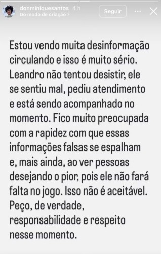 “Leandro não tentou desistir. Ele se sentiu mal, pediu atendimento e está sendo acompanhado neste momento. Fico muito preocupada como essas informações falsas se espalham e, mais ainda, ao ver pessoas desejando o pior, pois ele não fará falta no jogo. Isso não é aceitável”, desabafou Donminique.