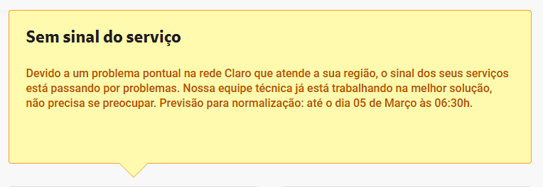 No site, a Claro informou que o sinal dos serviços está com problemas pontuais e que equipes já estão trabalhando para normalizar a situação. Além disso, a empresa de telefonia informou que a previsão para normalização dos serviços é até às 05h30 desta quinta-feira (05/03).
