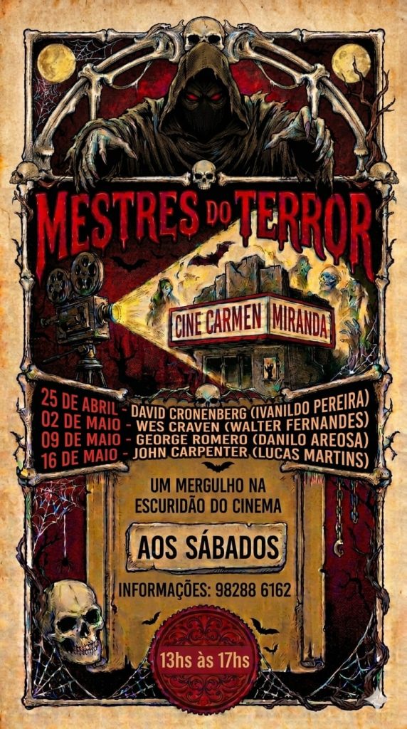 Atenção cinéfilos e público de Manaus: o curso de cinema “Mestres do Terror”, voltado especificamente para o gênero, está com inscrições abertas para quem deseja estudar e conhecer sobre o medo na sétima arte. As aulas ocorrerão sempre aos sábados no Cine Carmen Miranda, Centro de Manaus, nos dias 25 de abril, e 2, 9 e 16 de maio, das 13h às 17h.