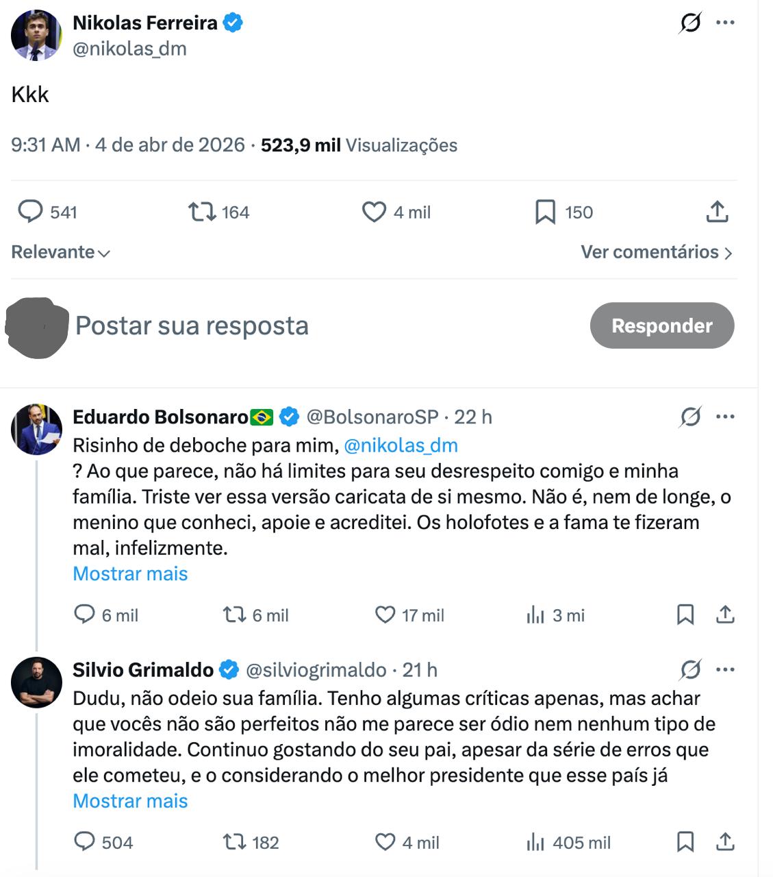 A situação se intensificou após interações envolvendo o professor Silvio Grimaldo, crítico recente da família Bolsonaro. O “kkk” de Nikolas foi interpretado por Eduardo como deboche, levando ao confronto público.