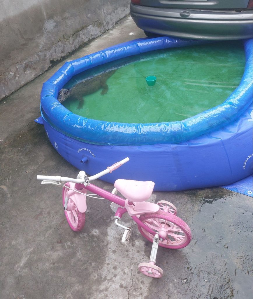 “Quando meu esposo chegou em casa ele me acordou e falou: “Joyce tu acredita que tem um jacaré na piscina das crianças?! Aí eu não quis acreditar. Aí ele disse: é verdade. Nisso as crianças acordaram, eu levantei e quando eu vim para cá, o jacaré estava lá, se refrescando dentro da piscina das crianças, tranquilo e calmo”, relatou a dona da residência que fica localizada na Rosa de Saron.