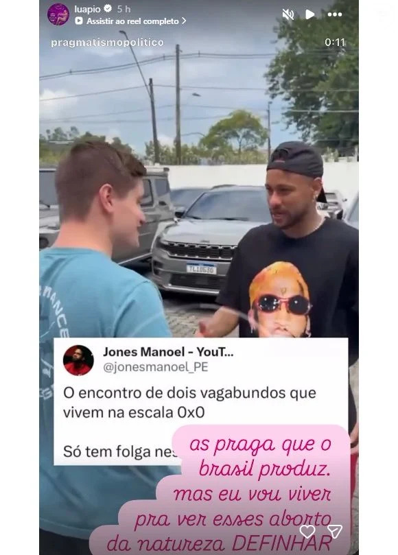 No domingo (12/4), a atriz Luana Piovani voltou a detonar o jogador de futebol Neymar Jr.. Em story no Instagram, Luana compartilhou post que mostrava foto de Neymar com o vereador Lucas Pavanato (PL-SP) e chamou os dois de “praga” e “abortos da natureza”.