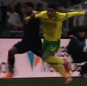 Inicialmente, o árbitro Mathieu Vernice aplicou o segundo cartão amarelo ao jogador, que já havia sido advertido no início da partida. Após revisão do VAR, no entanto, o juiz reconsiderou a decisão, anulou o amarelo e aplicou cartão vermelho direto, ao entender que houve agressão no lance.