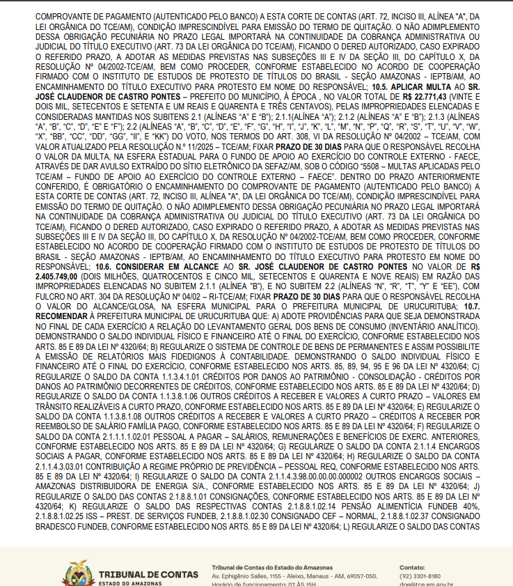 O Tribunal de Contas do Estado do Amazonas (TCE-AM) julgou irregulares as contas de 2020 da Prefeitura de Urucurituba, sob responsabilidade do ex-prefeito José Claudenor de Castro Pontes. A decisão foi tomada por unanimidade pelos conselheiros da Corte, que determinaram a devolução de R$ 2,4 milhões aos cofres públicos, além da aplicação de multas, que somam mais de R$ 56 mil.