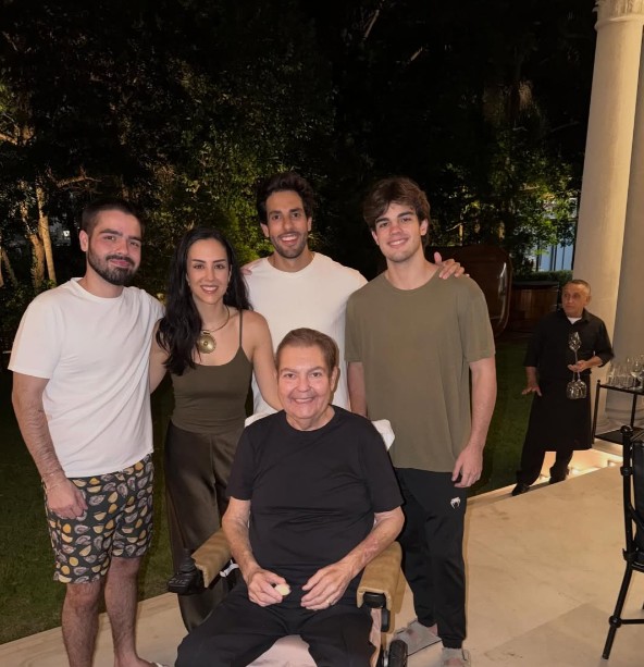 O registro foi compartilhado durante a comemoração do aniversário de Lara Silva, filha mais velha do apresentador. Na foto, Faustão aparece em uma cadeira de rodas, cercado pelos filhos e pelo genro, Julinho Casares, em um momento intimista e familiar.