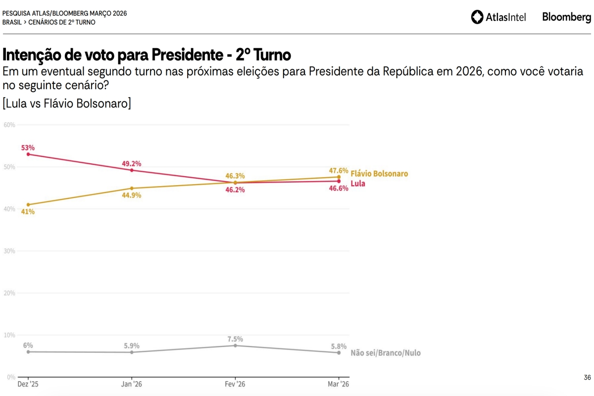Pesquisa divulgada nesta quarta-feira (25/) pelo instituto AtlasIntel em parceria com a Bloomberg mostra um empate técnico entre o senador Flávio Bolsonaro (PL-RJ) e o presidente Luiz Inácio Lula da Silva (PT) em um eventual segundo turno na disputa pelo Palácio do Planalto nas eleições deste ano.