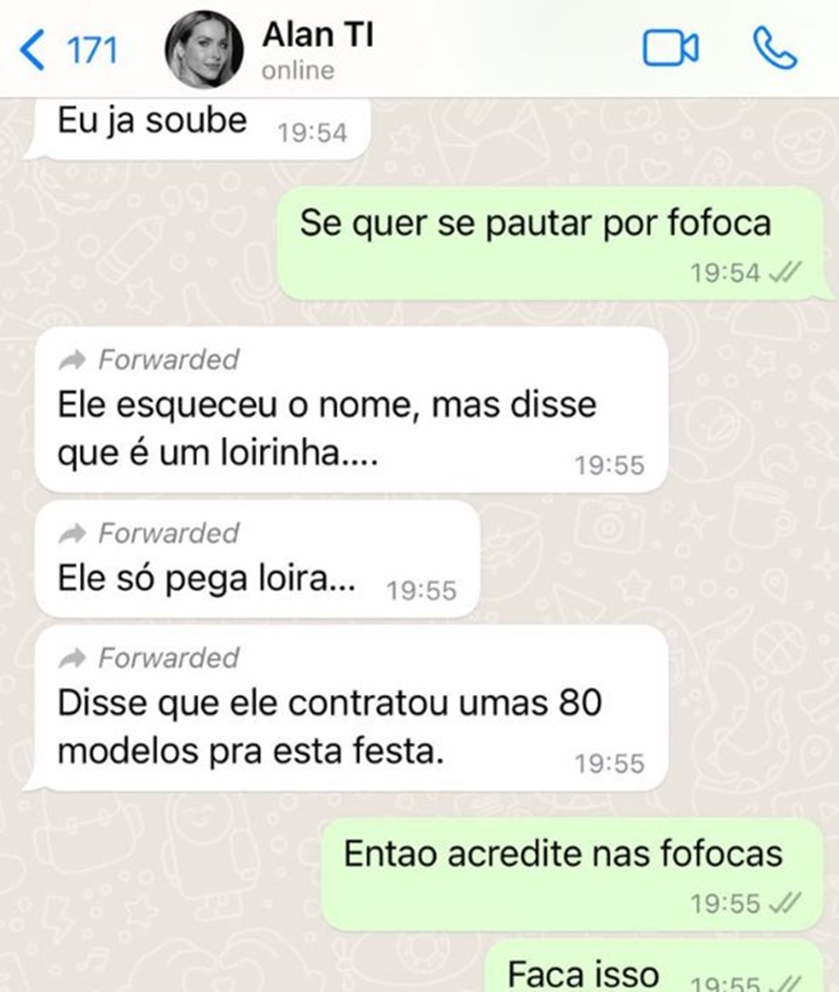 Na imagem que viralizou, aparece um diálogo entre o empresário e um contato salvo na agenda como “Alan da TI”. No entanto, o perfil exibido na conversa mostra uma foto que seria da atriz Monique Alfradique. Até o momento, não há confirmação de que o número pertença de fato à atriz.