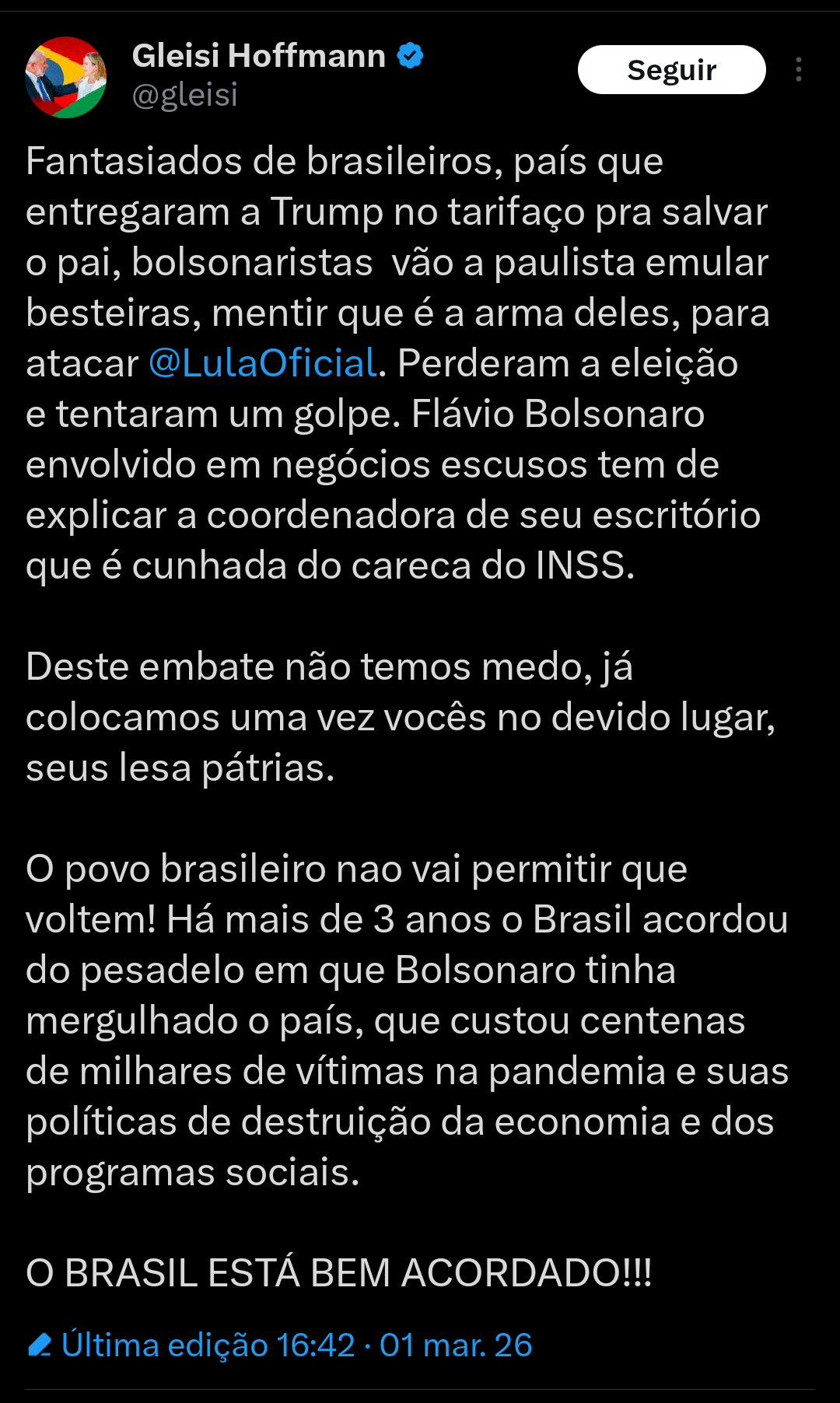 “Fantasiados de brasileiros, país que entregaram a Trump no tarifaço pra salvar o pai, bolsonaristas vão à Paulista emular besteiras, mentir (…) para atacar Lula. Perderam a eleição e tentaram um golpe”, escreveu Gleisi.