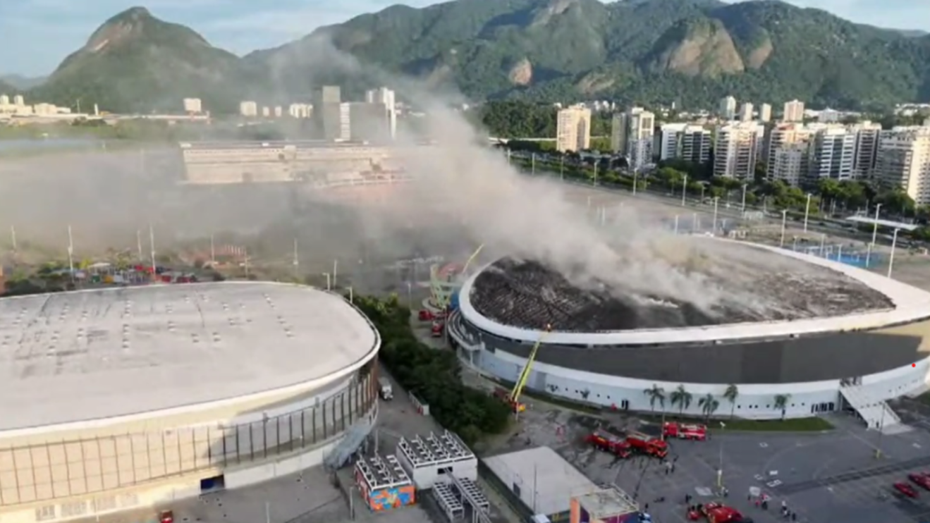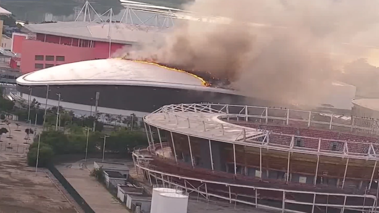 Vídeos que circulam nas redes sociais mostram uma extensa faixa de fogo ao longo do teto do Velódromo e uma grande coluna de fumaça sobre o local.