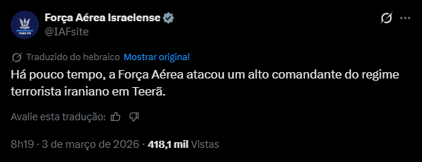 As Forças de Defesa de Israel (IDF) anunciaram um ataque em Teerã nesta terça-feira (3/3), que teria resultado na morte de um comandante do alto escalão iraniano. O nome do alvo não foi revelado. A ofensiva ocorre no quarto dia da escalada militar no Oriente Médio.