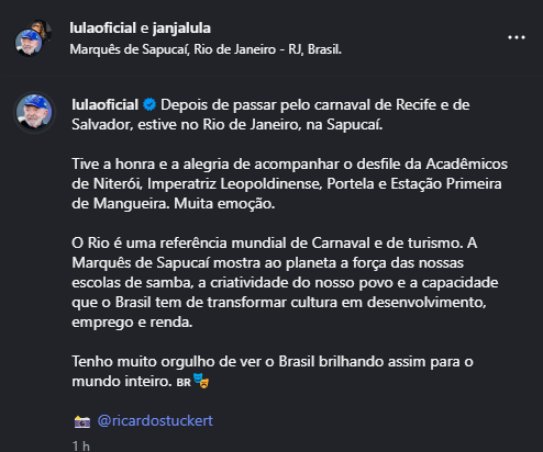 O presidente Luiz Inácio Lula da Silva (PT) usou as redes sociais na manhã desta segunda-feira de Carnaval (16/2) para destacar sua participação nos desfiles da Marquês de Sapucaí, no Rio de Janeiro. A publicação ocorreu após a homenagem recebida pela Acadêmicos de Niterói e em meio a críticas da oposição, que acusa o evento de ter assumido caráter político-eleitoral.