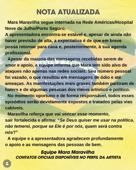 Em nota, a assessoria afirmou que os episódios mais graves serão tratados “pelas vias cabíveis” no momento adequado. A equipe também informou que Mara segue internada e estável, mas ainda não há previsão de alta, embora a expectativa seja de recuperação e retorno gradual às atividades profissionais.