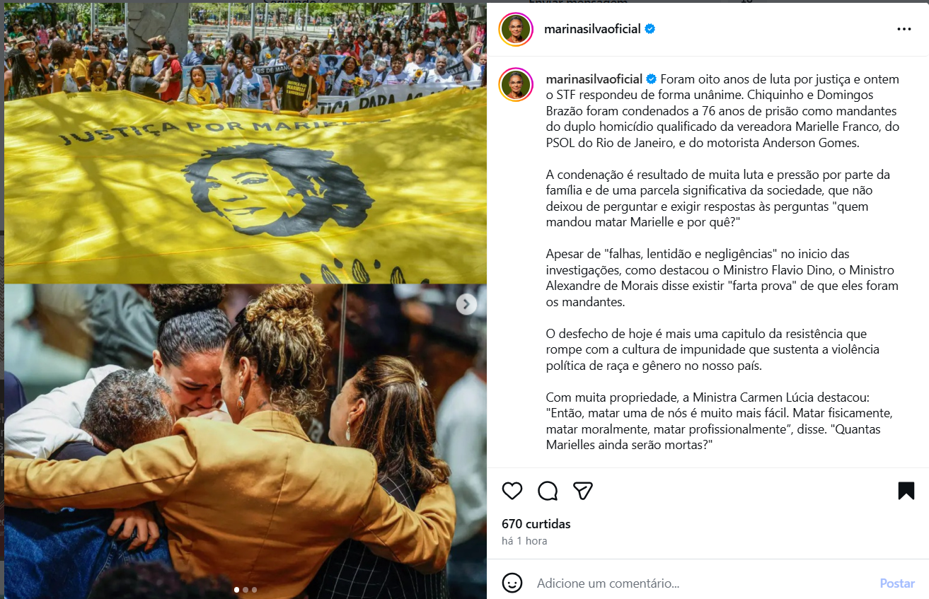 A ministra concluiu a publicação com uma reflexão sobre a violência política de gênero e raça, ecoando as palavras da ministra Cármen Lúcia. “Com muita propriedade, a ministra Cármen Lúcia destacou: ‘Então, matar uma de nós é muito mais fácil. Matar fisicamente, matar moralmente, matar profissionalmente’, disse. ‘Quantas Marielles ainda serão mortas?’ A luta incansável na defesa dos direitos humanos continua. Marielle vive!”