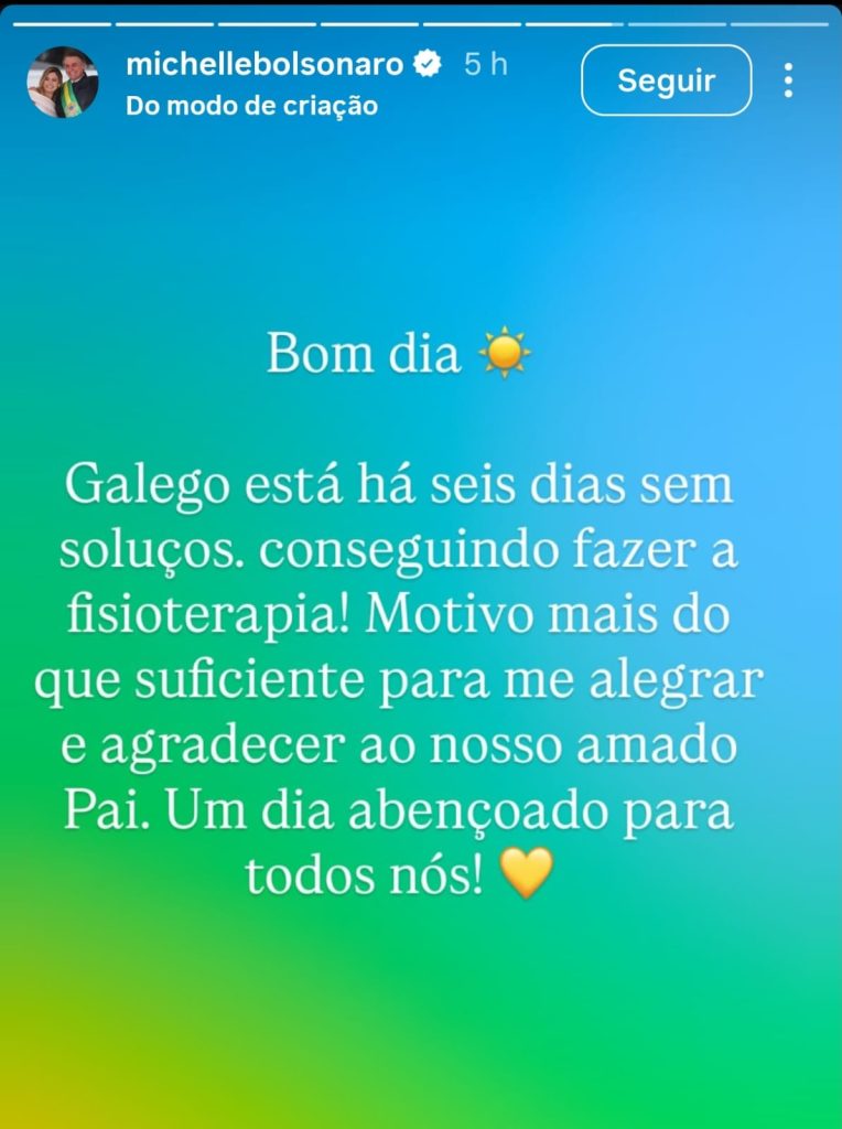 Na postagem, Michelle celebrou a melhora do marido e agradeceu pela recuperação: “Galego está há seis dias sem soluços. Conseguindo fazer a fisioterapia! Motivo mais do que suficiente para me alegrar e agradecer ao nosso amado Pai”.