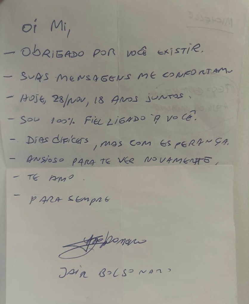 Na mensagem, Bolsonaro afirma viver “dias difíceis, mas com esperança”, diz estar ansioso para reencontrar Michelle e reforça ser “100% fiel” à esposa. O bilhete é encerrado com expressões como “te amo” e “para sempre”, além da referência à data do aniversário de casamento.