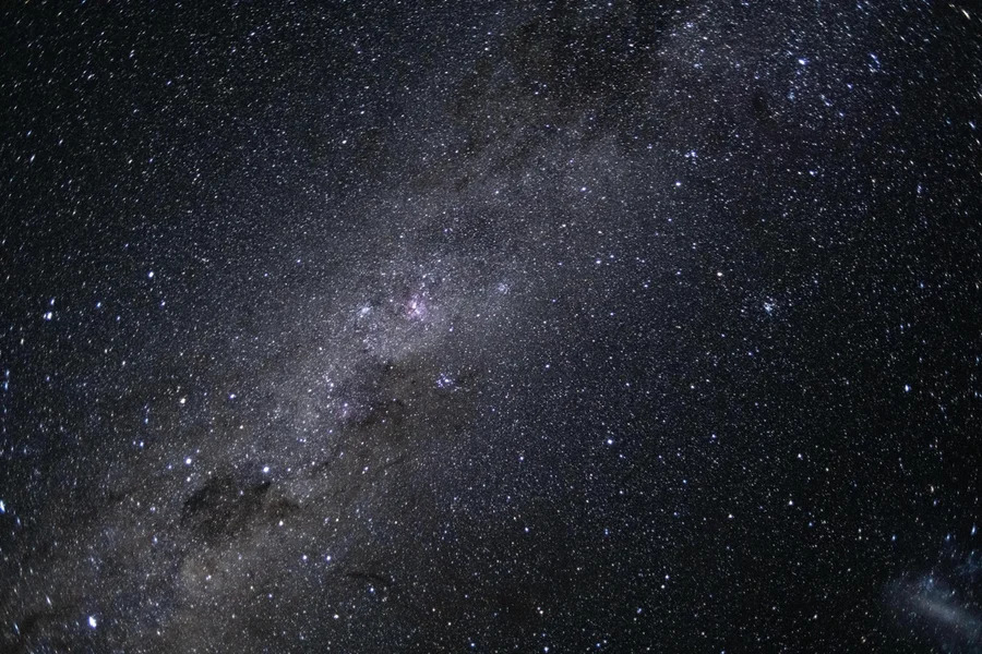 A imagem revela um campo estrelado, com milhares de estrelas e nuvens brilhantes de poeira que compõem a estrutura da nossa galáxia.