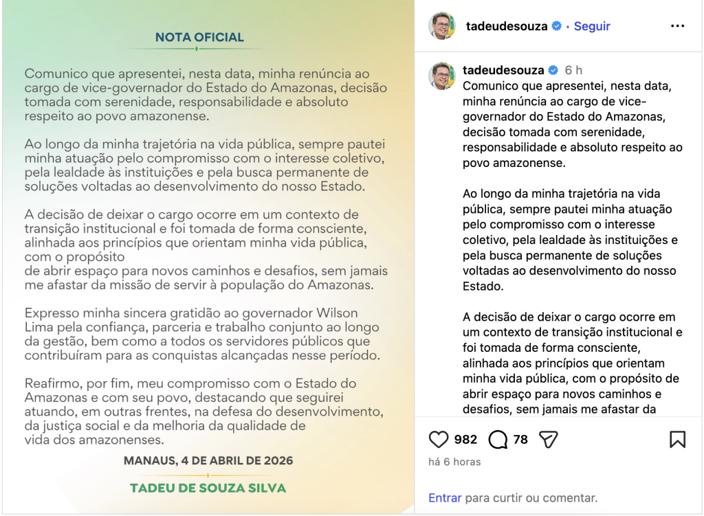 O vice-governador do Amazonas, Tadeu de Souza Silva, anunciou na madrugada deste domingo (5) sua renúncia ao cargo por meio de uma nota oficial publicada nas redes sociais. A decisão, segundo ele, foi tomada com “serenidade, responsabilidade e absoluto respeito ao povo amazonense”, e já provoca forte repercussão no cenário político estadual.
