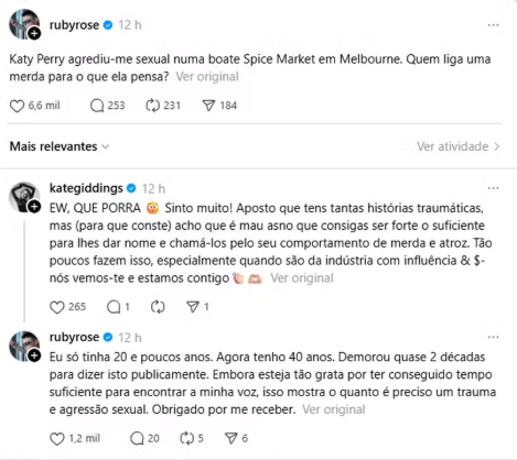 A atriz Ruby Rose usou a rede social Threads no domingo (12/04) para acusar a cantora Katy Perry de abuso sexual. O crime teria ocorrido há cerca de 20 anos em uma boate em Melbourne, na Austrália.
