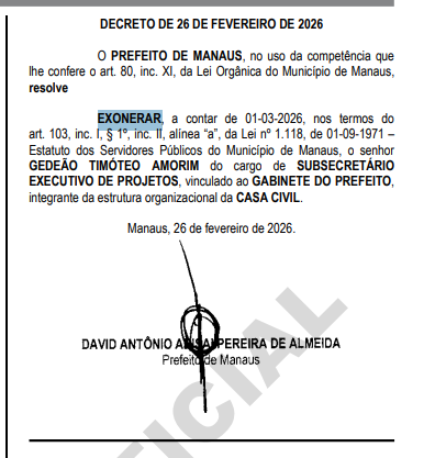 O prefeito de Manaus, David Almeida (Avante), exonerou o professor Gedeão Timóteo Amorim do cargo de subsecretário executivo de Projetos, vinculado ao Gabinete do Prefeito e integrante da estrutura organizacional da Casa Civil. O decreto foi publicado no Diário Oficial do Município desta sexta-feira (27/02) com efeitos a contar de 1º de março.