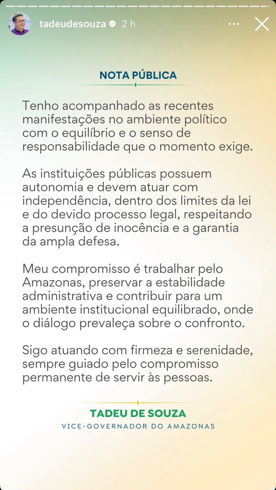 Na nota, o vice-governador afirmou ainda que segue atuando “com firmeza e serenidade”, guiado pelo compromisso permanente de servir à população amazonense.