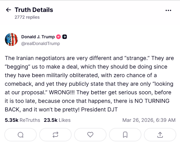 O presidente dos Estados Unidos, Donald Trump, afirmou nesta quinta-feira (26/3) que o Irã está “implorando” por um acordo de cessar-fogo na guerra que já dura quase um mês. Em publicação na rede social Truth Social, Trump voltou a ameaçar o regime iraniano e criticou a postura dos negociadores do país.